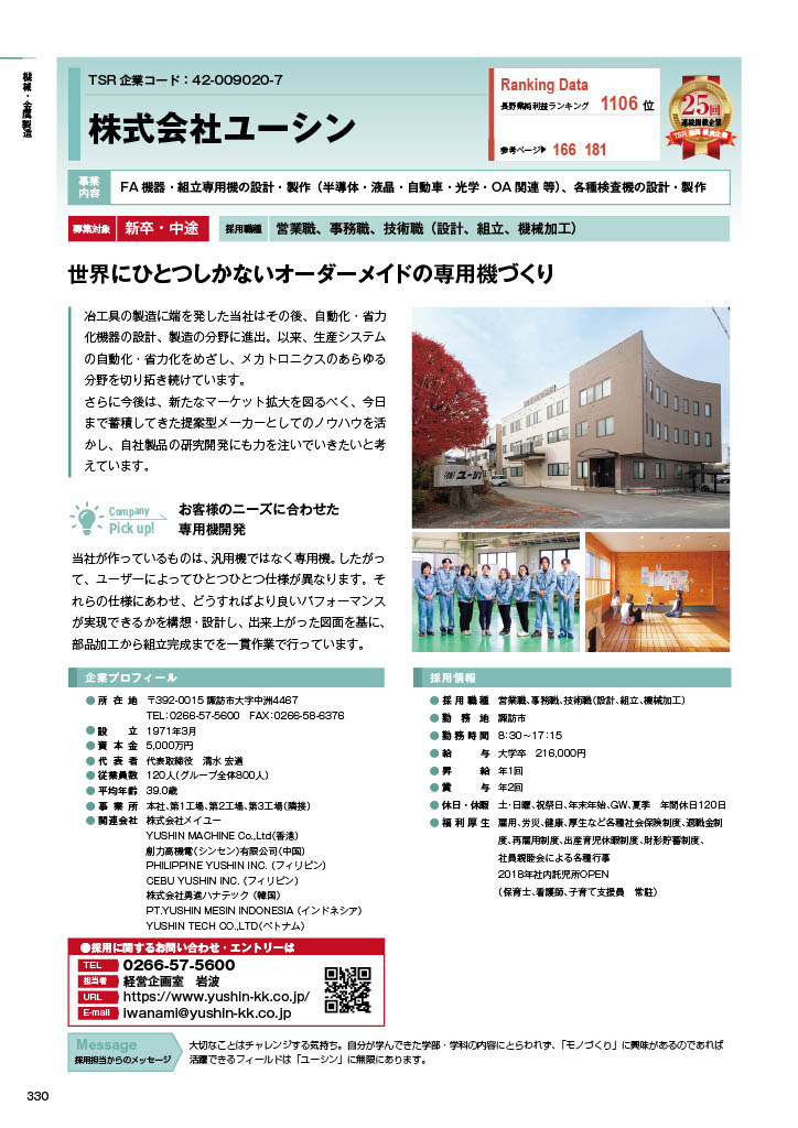 (株)東京商工リサーチが発行している雑誌ALEVELに、今年も当社ユーシンが長野県の優良企業として掲載されました。